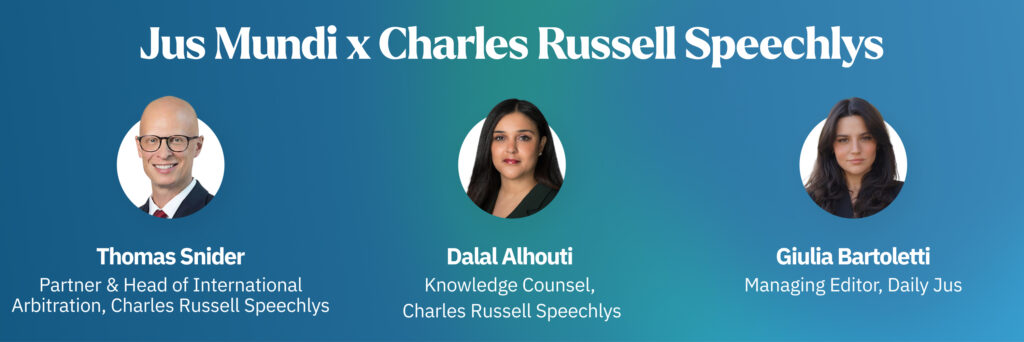 On 7 October 2025, Jus Mundi and international law firm Charles Russell Speechlys LLP hosted a seminar in Paris exploring the development and use of artificial intelligence (“AI”) in international arbitration. The panellists comprised Simon Le Wita, Partner at Charles Russell Speechlys LLP in Paris, Monica Crespo Chanis, Head of Product at Jus Mundi, and Alexis Mourre, Arbitrator and Founder of MCL Arbitration. The seminar was introduced by Thomas R. Snider, Partner and Head of International Arbitration at Charles Russell Speechlys LLP in Dubai, and Jean-Rémi de Maistre, Co-Founder and CEO of Jus Mundi, and the panellist discussion was moderated by Jue Jun Lu, Partner at Charles Russell Speechlys LLP in London.