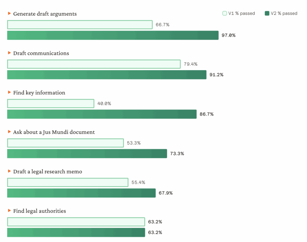 Across 60 expert-authored tasks and more than 1,000 evaluation points, Jus AI 2 consistently outperformed its predecessor, delivering more accurate reasoning, stronger citations, and outputs closer to professional legal writing.